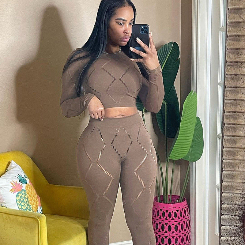 Women's Hollow-out Ripped High Waist Tight Pants Casual Sports Suit